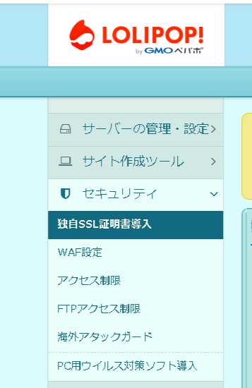 ロリポップの設定画面からセキュリティ>WAF設定を選びます。