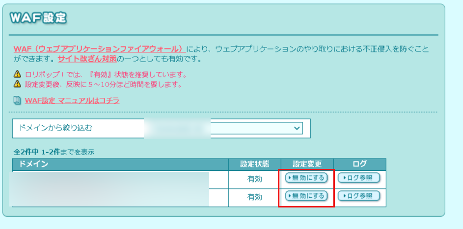 終わったらWAF設定を「有効」に戻しておくようにしましょう。